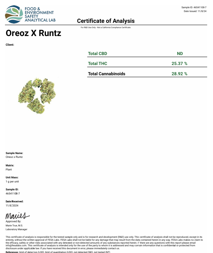 - Cannabinoid profile (THCA, Delta-9, CBD, minor cannabinoids)